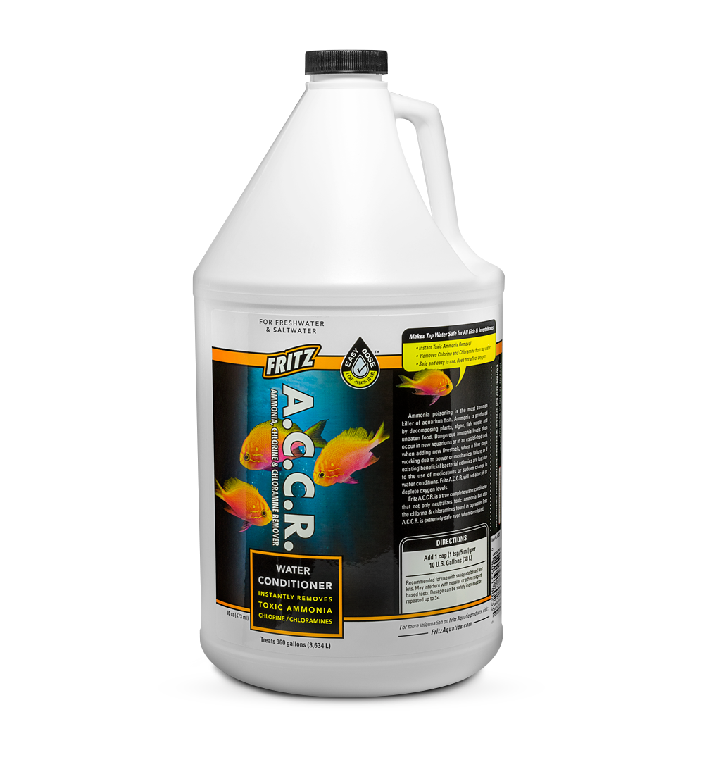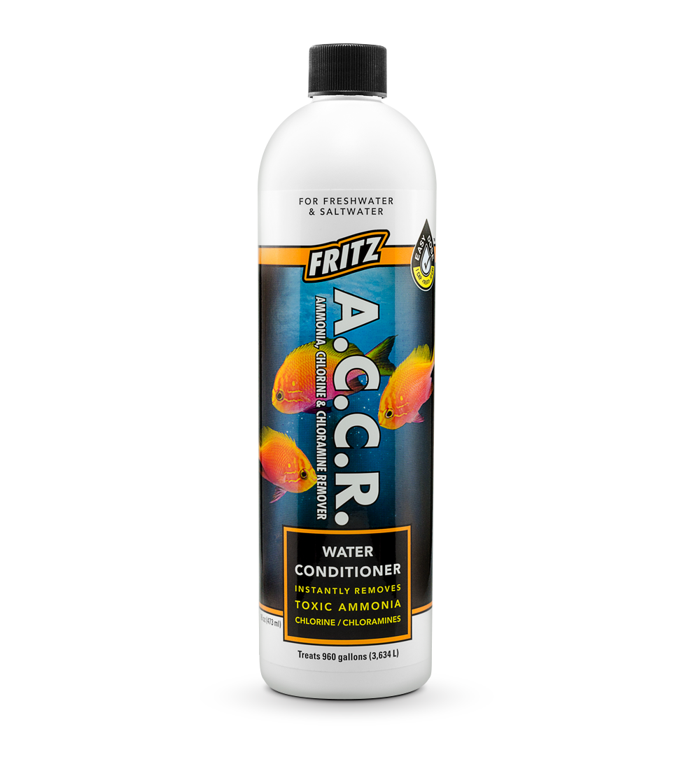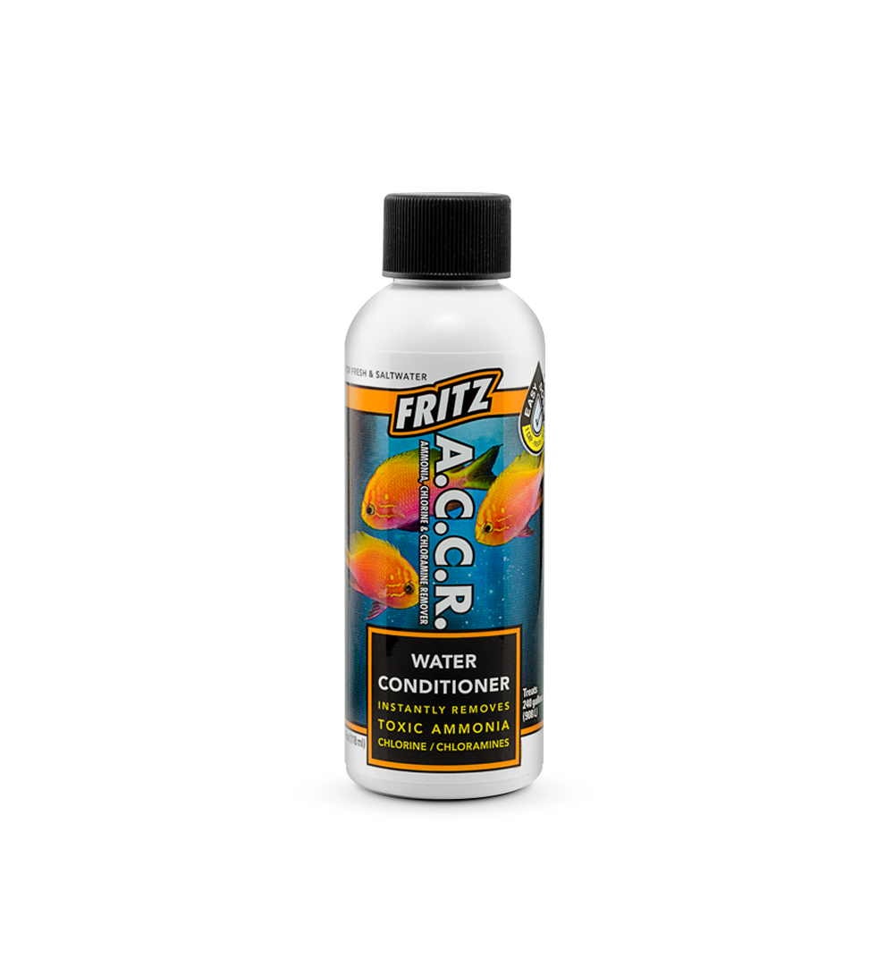 Ammonia poisoning is the most common killer of aquarium fish. Ammonia is produced by decomposing plants, algae, fish waste and uneaten food. Dangerous ammonia levels often occur in new aquariums or in an established tank when adding new livestock, when a filter stops working due to power or mechanical failure or if existing beneficial bacterial colonies are lost due to the use of medications or sudden change in water conditions. Fritz A.C.C.R. will not alter pH or deplete oxygen levels. Fritz A.C.C.R. is a true complete water conditioner that not only neutralizes toxic ammonia but also the chlorine and chloramines found in tap water. Fritz A.C.C.R. is extremely safe even when overdosed.