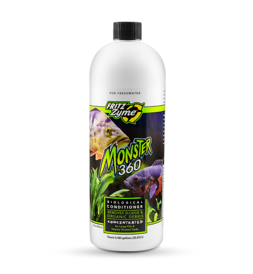 FritzZyme® MONSTER 360 is a powerful, concentrated probiotic blend of naturally occurring, environmentally friendly, live heterotrophic bacteria capable of digesting organic sludge common in aquariums. FritzZyme® MONSTER 360 has been specially formulated to handle the organic waste produced by “monster” fish, including oscars, arowana, freshwater stingrays, piranha, peacock bass, arapaima, gar, etc., as well as heavily-stocked tanks (African cichlids). Sludge includes fish waste, leftover food and other decaying organic matter. Using FritzZyme® MONSTER 360 as part of a regular maintenance program will greatly reduce aquarium care including gravel vacuuming and water changes, as well as prolonging filter media life. The bacteria in FritzZyme® MONSTER 360 is safe, non-toxic and non-pathogenic.