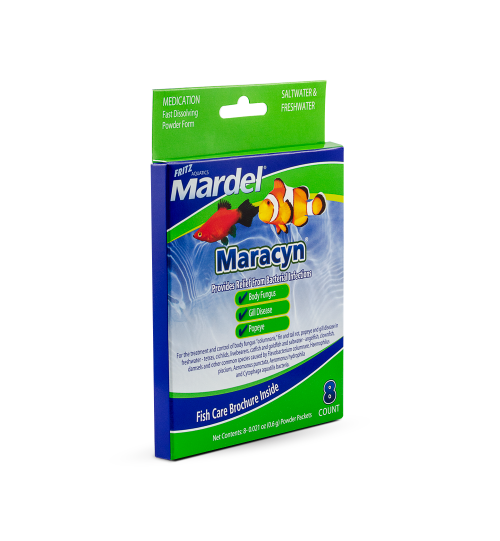 Mardel Maracyn® is a specially compounded broad-spectrum antibiotic (erythromycin) which has been shown to be effective against a number of pathogenic bacteria associated with ornamental fish disease. It was developed for complete but gradual dissolution in water. It is primarily effective against gram-positive pathogenic organisms. Symptoms of clamped fins, swollen eyes, heavy or rapid breathing, patchy coloration, change in swimming behavior or corner-hiding can be signs of possible bacterial infection.