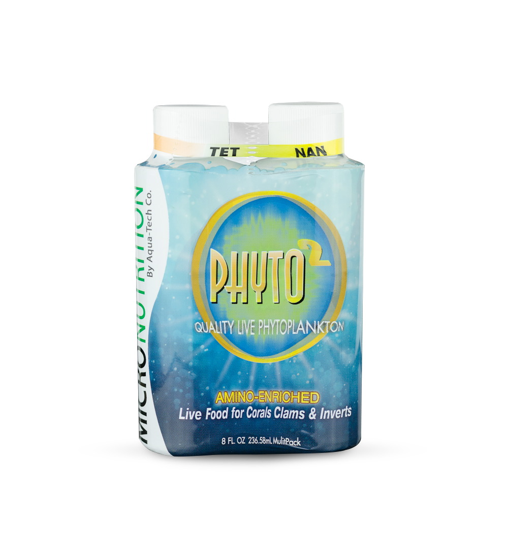 PHYTO2 multi-packs are our most popular reef aquarium supplement. Utilizing osmotic pressurization, Aqua-Tech Co. has enriched its live phytoplankton products with 15 amino acids in the ratios found in wild scleractinian coral. This places the aminos right in the food for heterotrophic feeding! This is the first time this is available in a live food.